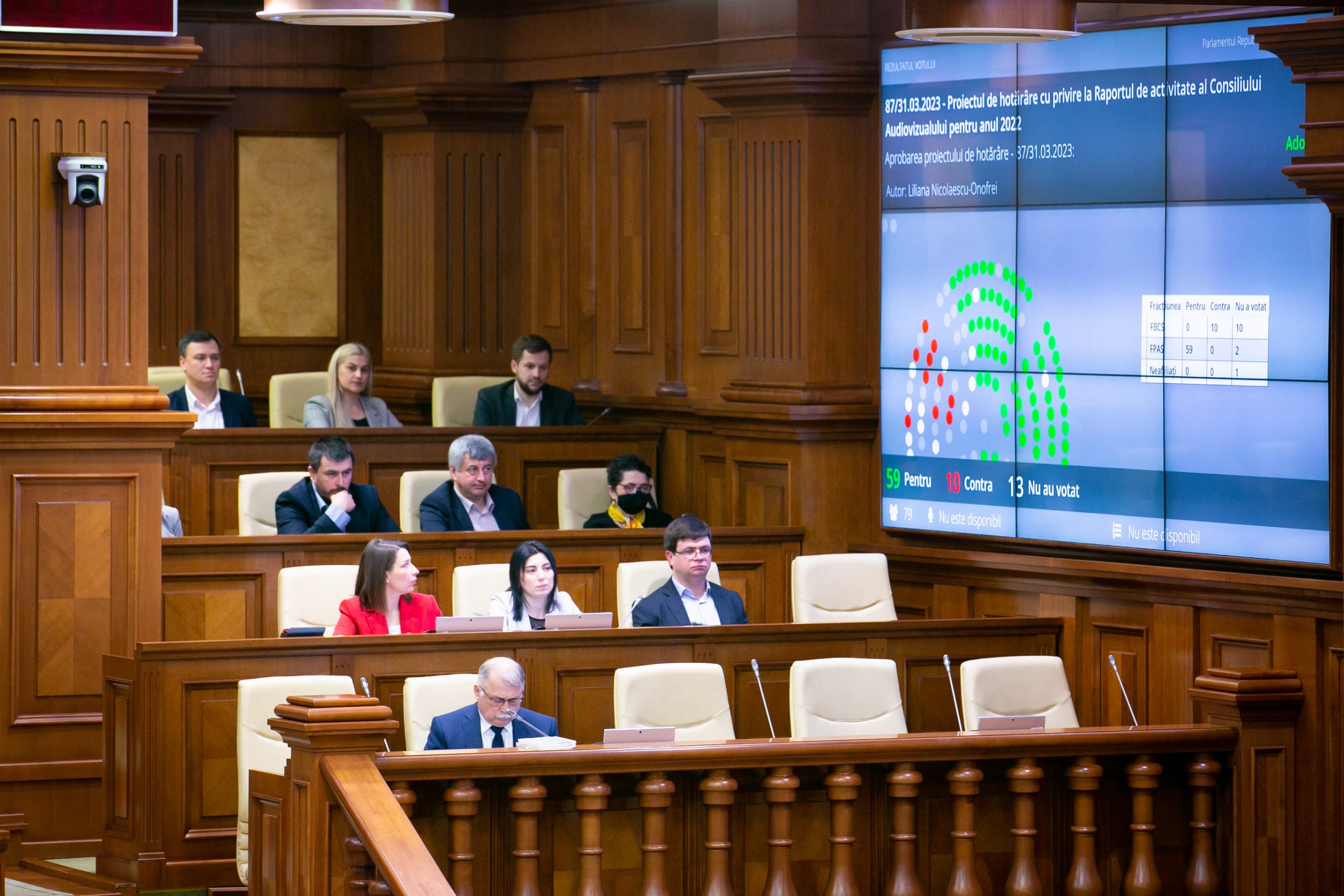 Deputații au examinat și au aprobat cu majoritate de voturi Raportul de activitate al Consiliului Audiovizualului pentru anul 2022. Pentru au votat 59 de deputați ai fracțiunii Partidului pentru Acțiune și Solidaritate, împotrivă s-au exprimat 10 deputați ai Blocului Comuniștilor și Socialiștilor, iar 13 deputați s-au abținut de la vot.